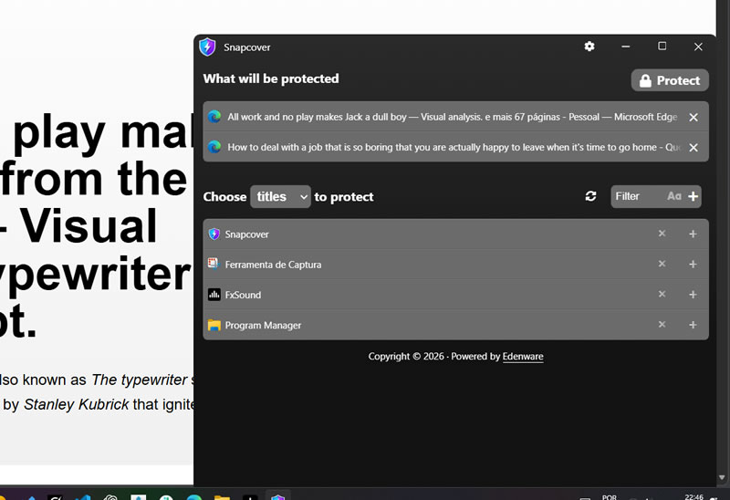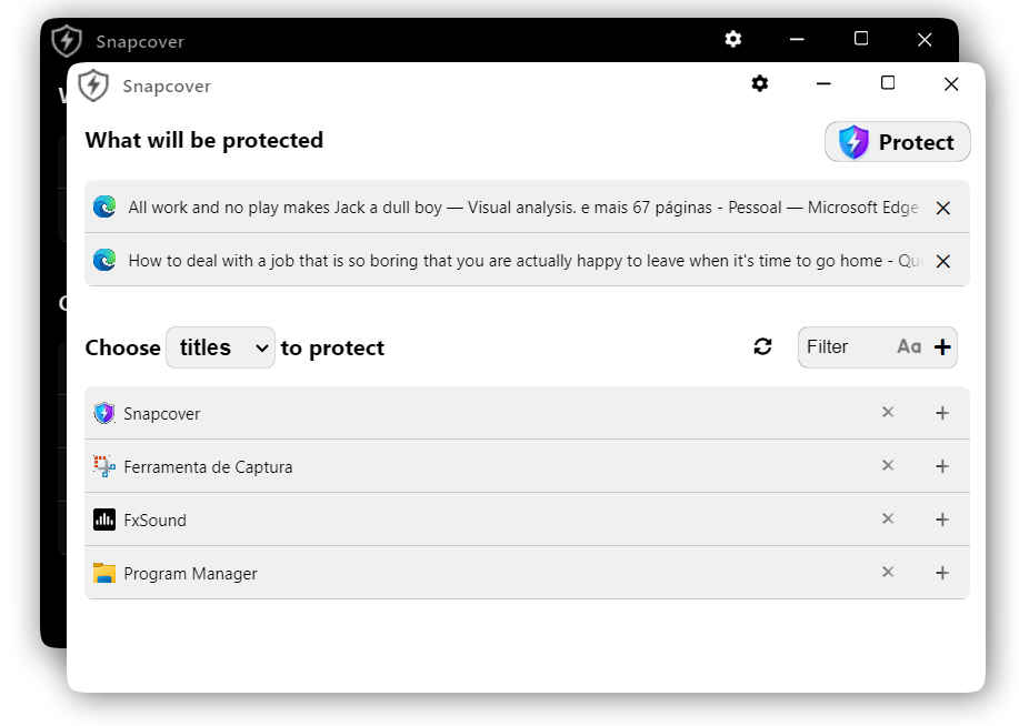 Open Snapcover, select the running applications you want to protect, then use the Protect button or your global shortcut to hide them instantly.